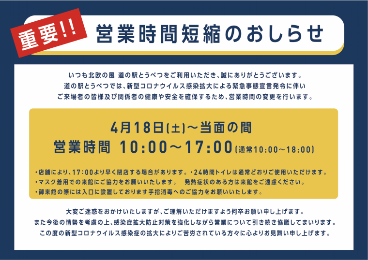 新型コロナウイルス感染拡大による緊急事態宣言発令に伴い「道の駅 なないろ・ななえ」では、感染拡大を防ぐ為、上記営業時間とさせていただきます。