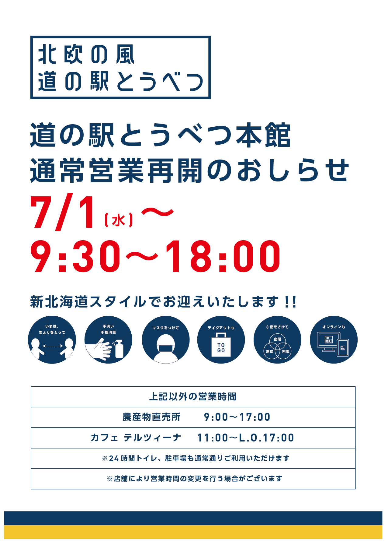 新型コロナウイルス感染拡大防止に伴い、7月1日からの道の駅内店舗の夏季営業時間を、下記のとおり変更させていただきます。