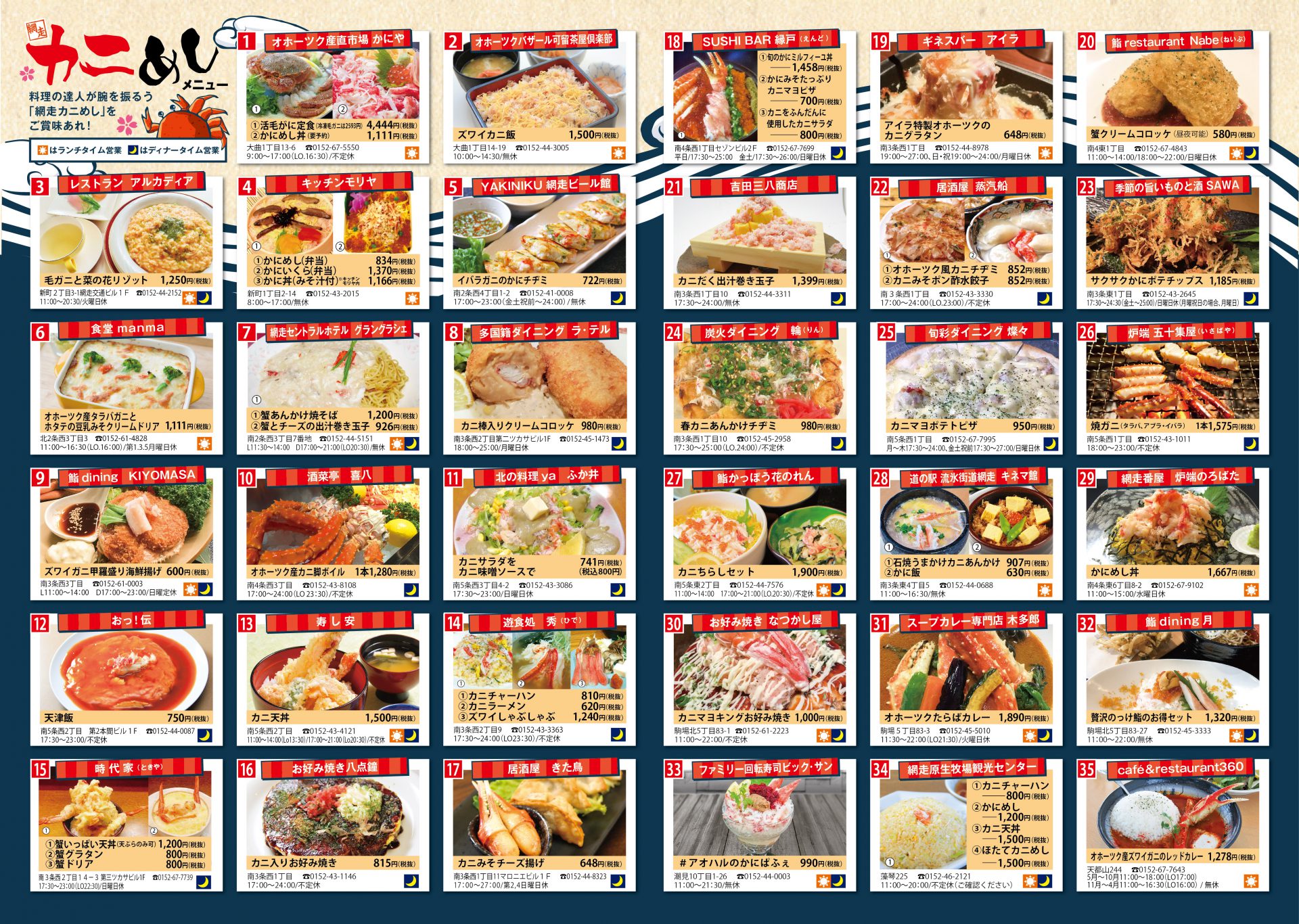 毎年大人気、カニめし食べて、スタンプ3つ集めて豪華景品が当たる!今年も始まります!今年は35軒の人気飲食店が自慢のカニ料理を考案!おいしいまち網走をご堪能ください!