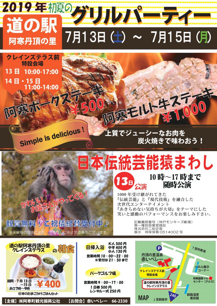 道の駅阿寒丹頂の里では7月13日から7月15日に「初夏のグリルパーティー」を開催、上質でジューシーなステーキを炭火焼きで味わえます。