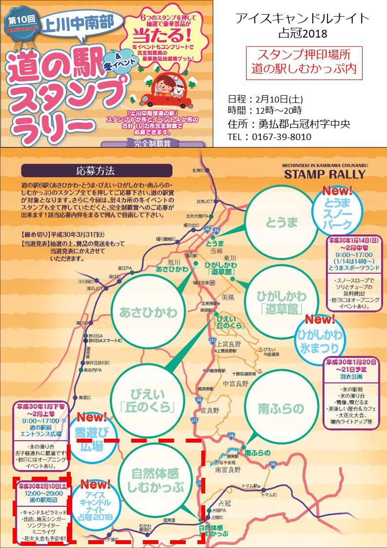 2月10日(土)の12時~、丘のくらも参加しております「上川中南部スタンプラリー」の冬イベント第4弾の「アイスキャンドルナイト占冠2018」が開催されます。スタンプが押印できるのはこの日一日のみと難易度は非常に高いですが、是非ご来場くださいませ。皆様のお越しをこころよりお待ちしております★