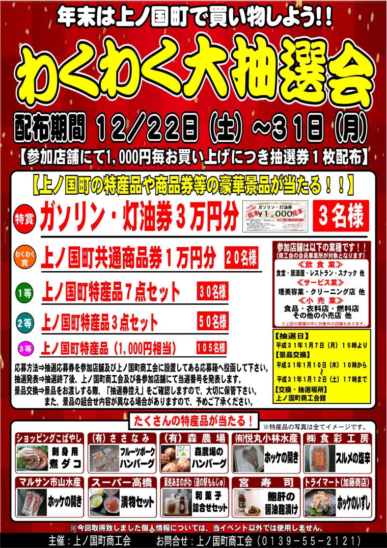 12/22(土)~31(月)年末わくわく大抽選会! 上ノ国もんじゅでは物産・レストランで1,000円毎お買い物をすることで抽選権が1枚配布されます!もちろん年末のおせち風オードブルも対象になりますよ! おせち風オードブルの予約は(55-3955)またはこちら わくわく大抽選会のお問い合わせは上ノ国町商工会(55-2121)まで! 印刷する