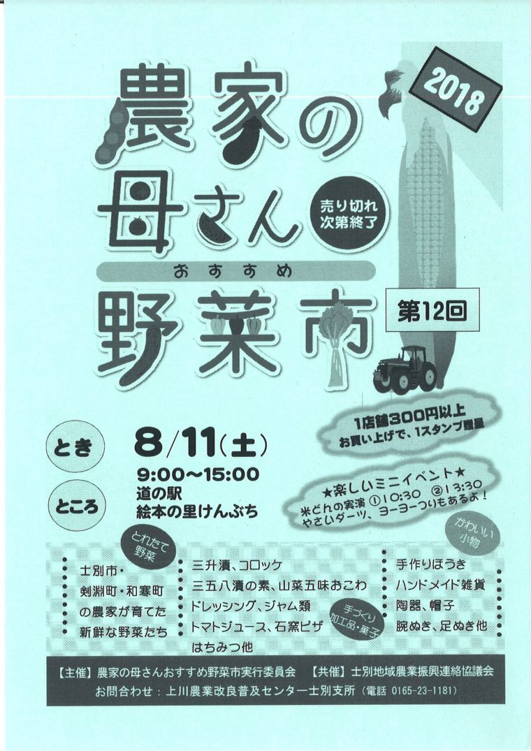 8月11日(土)9:00~15:00の日程で農家の母さん野菜市が開催されます。 士別・剣淵・和寒の新鮮野菜を販売いたします。 野菜はなくなり次第終了となりますので、お早めにご来場ください。 会場は道の駅北側で行われます。 印刷する