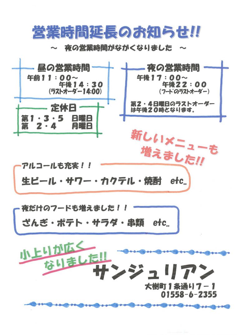 大樹町の飲食店「サンジュリアン」営業時間変更のお知らせです。