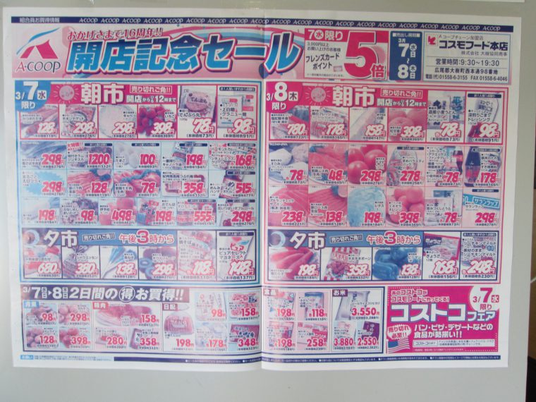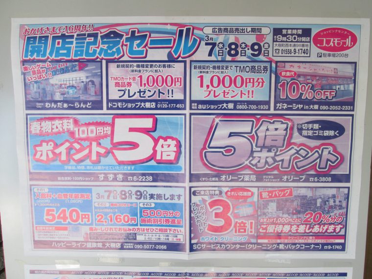 道の駅『コスモール大樹』、職員の佐藤です。。 当道の駅内ショッピングセンターは2002年3月に営業を開始しました。 おかげさまで16周年! 日頃の感謝をこめて開店記念セールを実施中 2018年3月7日・8日・9日の3日間です。 ぜひ、ご利用下さい。 印刷する