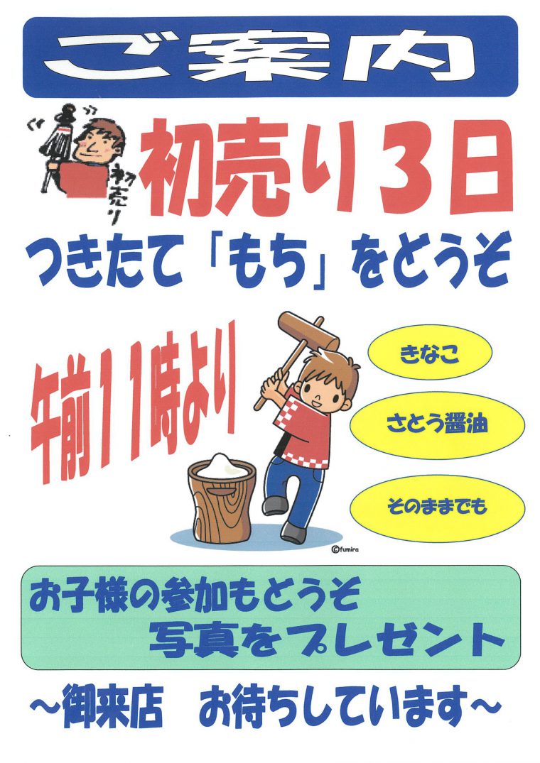 道の駅『コスモール大樹』、職員の佐藤です。 2019年1月3日、AM11時から「新春もちつき」を開催致します。 お子様ともちつきをしませんか?写真をプレゼント!! つきあがったおもちをおくばり致します。 印刷する