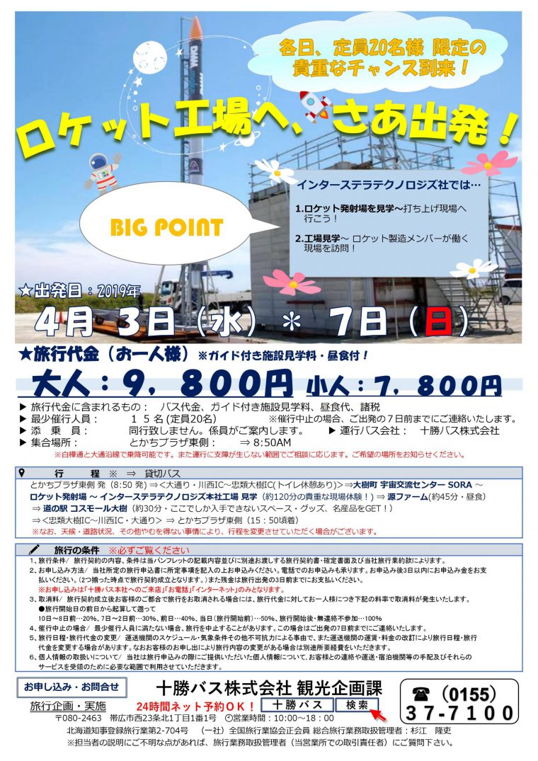道の駅『コスモール大樹』、職員の佐藤です。。 十勝バスさんのバスツアー「ロケット工場へ、さあ出発!」 只今募集中です。当道の駅にも立ち寄るプランになっております。 詳しくは、チラシをご確認下さい。 印刷する