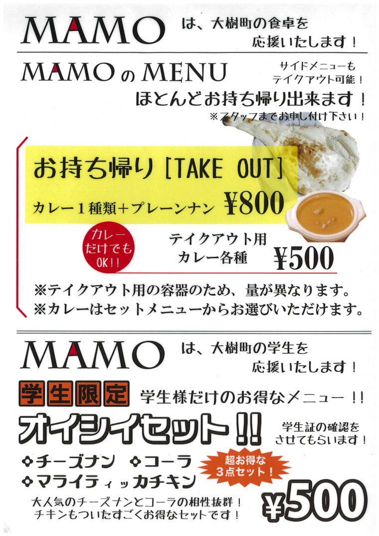道の駅『コスモール大樹』、職員の佐藤です。。 当道の駅内CAFE&DINING「MAMO」のメニュー表をアップします。 テイクアウトやランチ・ディナーやってます。 ぜひ、ご利用下さい。 お問い合わせ先01558-8-7570まで 印刷する