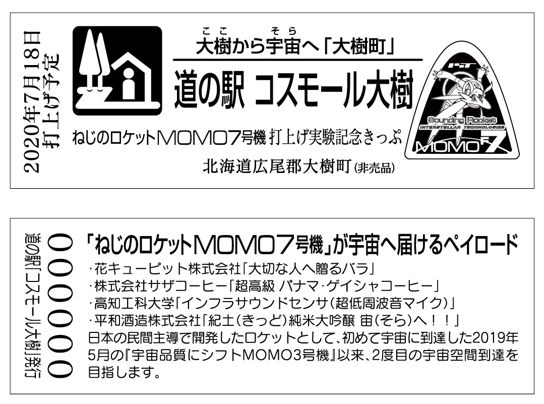 明日、打上げ実験予定のインターステラテクノロジズ社「ねじのロケットMOMO7号機」デザインの当道の駅特別記念きっぷを下記の内容で配布致します。