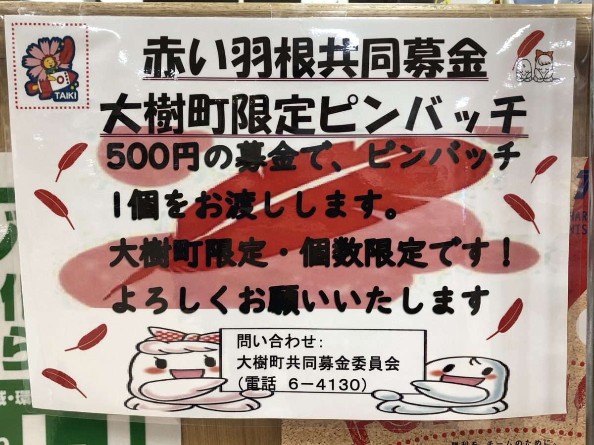 道の駅『コスモール大樹』、職員の佐藤です。。 当道の駅はFacebook&Twitterで大樹町の情報を発信しております。 皆様からの「いいね」や「フォロー」をよろしくお願い致します。 赤い羽根共同募金大樹町限定ピンバッチを当道の駅特産品コーナーレジカウンターで取扱開始致しました。 500円の募金で、ピンバッチ1個お渡し致します。 ご希望のお客様はレジカウンタ―スタッフにお申し付け頂きますようお願い致します。 印刷する