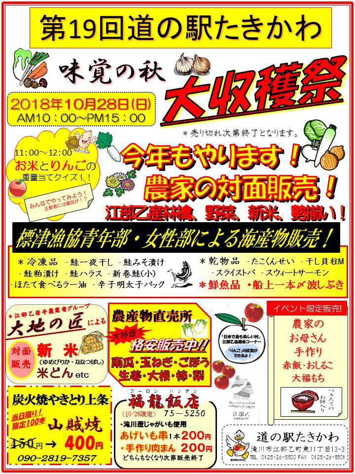 10/28(日)に第19回道の駅たきかわ「大収穫祭」が開催されます。