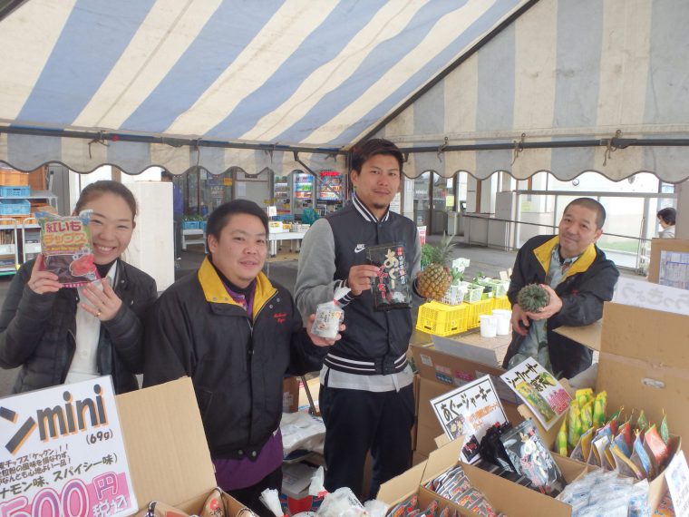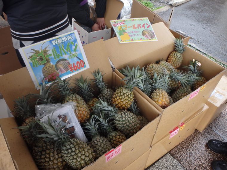 取れたて新鮮なパインやシークワーサ、伊江島産の小麦を使用した小麦チップスなど多数の商品が並んでいます。