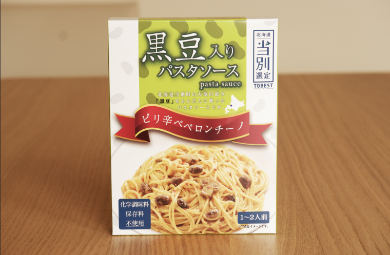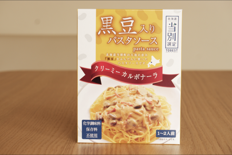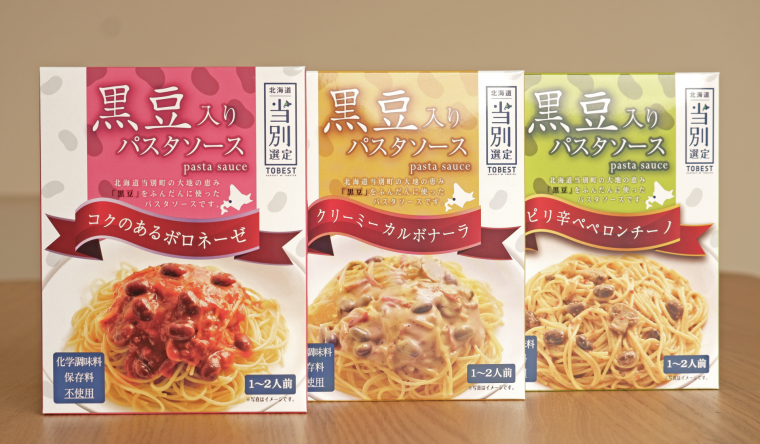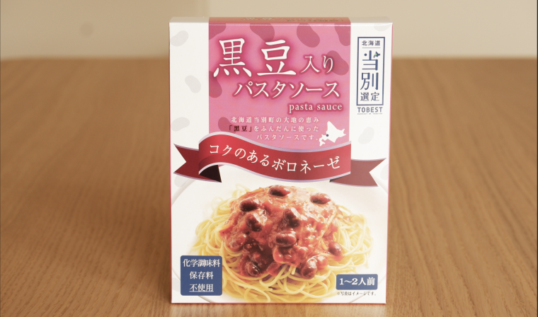 当別町産の黒豆を使用した【黒豆入りパスタソース】は