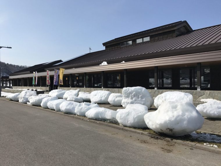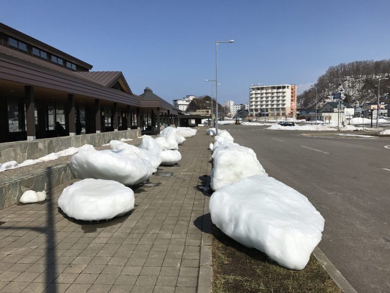毎年恒例となりました流氷展示ですが「流氷展示している道の駅で日本一」を目指し今年は過去最大の21個、設置しました。