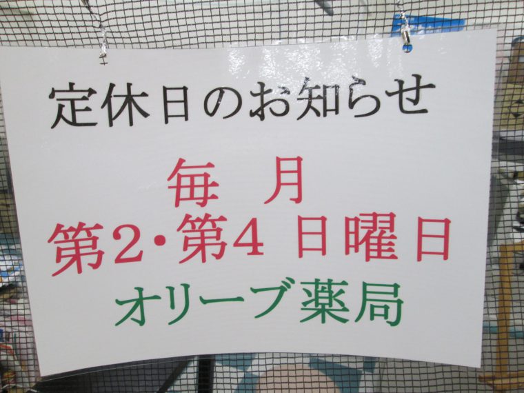 道の駅内「オリーブ薬局」から定休日のお知らせ。