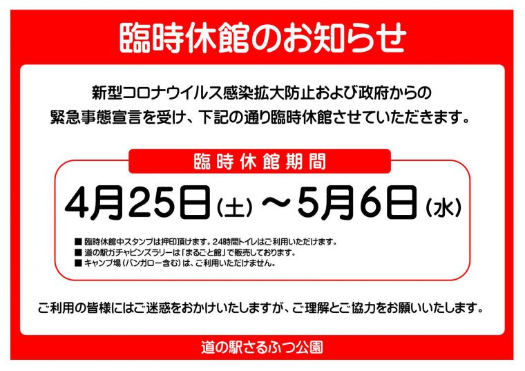 平素は道の駅さるふつ公園をご利用いただき誠にありがとうございます。