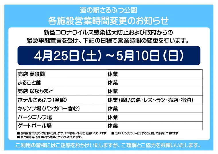 平素は道の駅さるふつ公園をご利用いただき誠にありがとうございます。