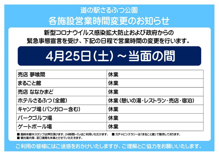 平素は道の駅さるふつ公園をご利用いただき誠にありがとうございます。