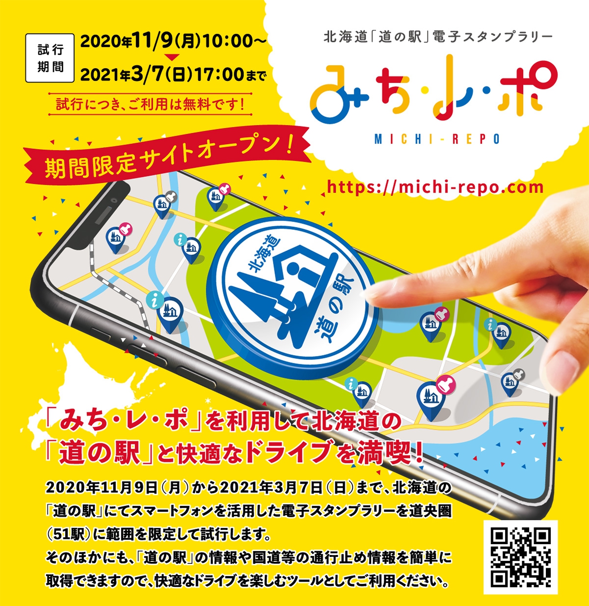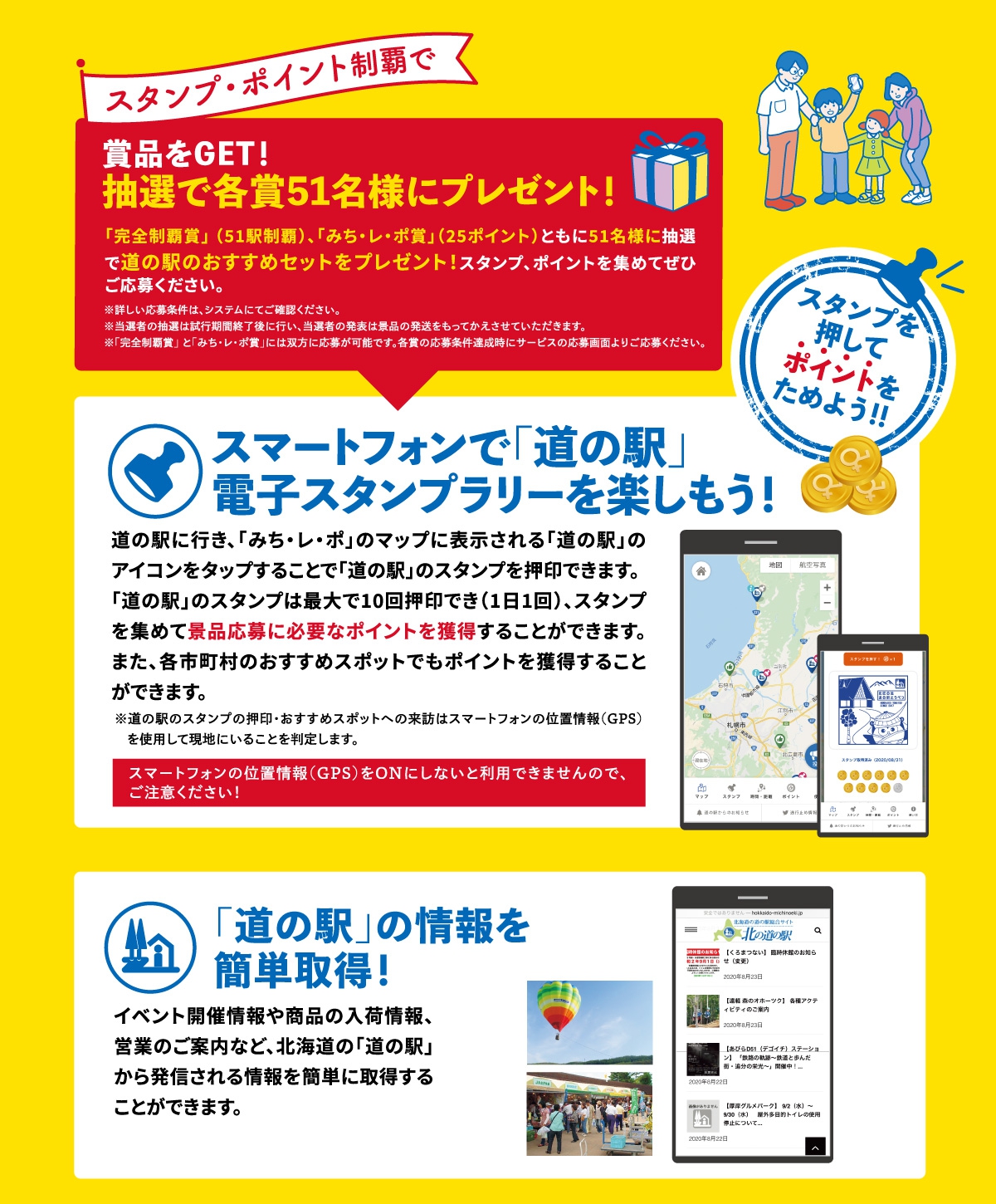 2020年11⽉9⽇(月)から2021年3⽉7⽇(日)まで、北海道の「道の駅」にてスマートフォンを活⽤した電⼦スタンプラリーを道央圏(51駅)に範囲を限定して試⾏します。