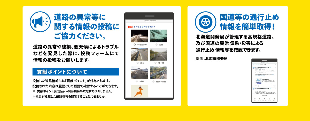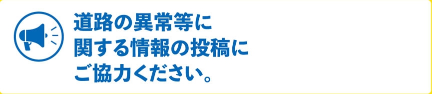 道路の異常や破損、悪天候によるトラブルなどを発⾒した際に、投稿フォームにて情報の投稿をお願いします。