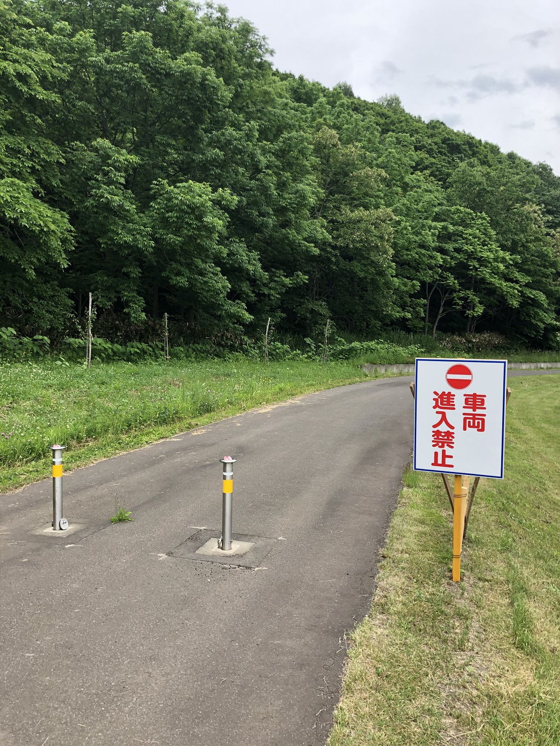 車止めを設置はしているのですが、さらに看板も設置させていただきました。(許可を得た車両は通行可)