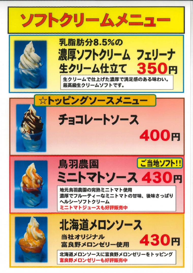 南富良野町物産センター売店では、一部リニューアルしソフトクリームの販売を開始しました。地元「鳥羽農園」のミニトマトを使用したソフトクリームや自社製品富良野メロンゼリーをトッピングした地元素材を使用したソフトクリームを提供しております。 印刷する