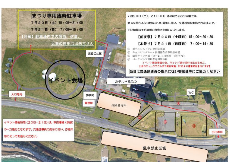 7月20日、21日行われる「第45回さるふつ観光まつり」開催に伴い、道の駅さるふつ公園一帯は交通規制を実施いたします。