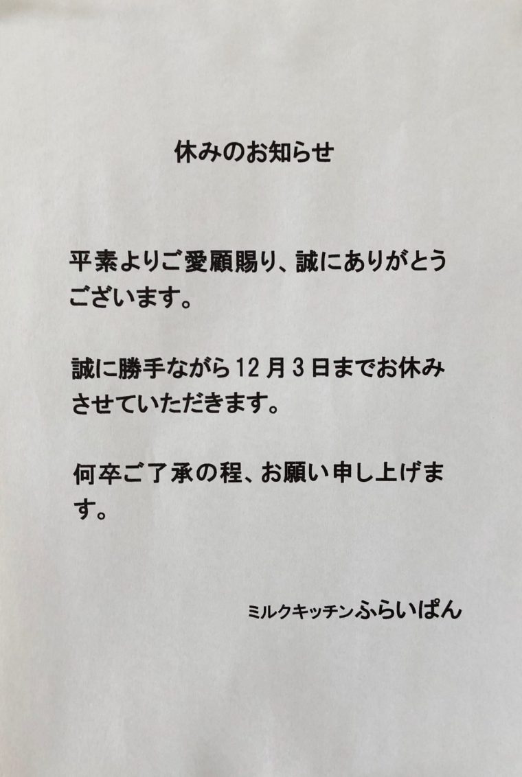 「ミルクキッチンふらいぱん」臨時休業