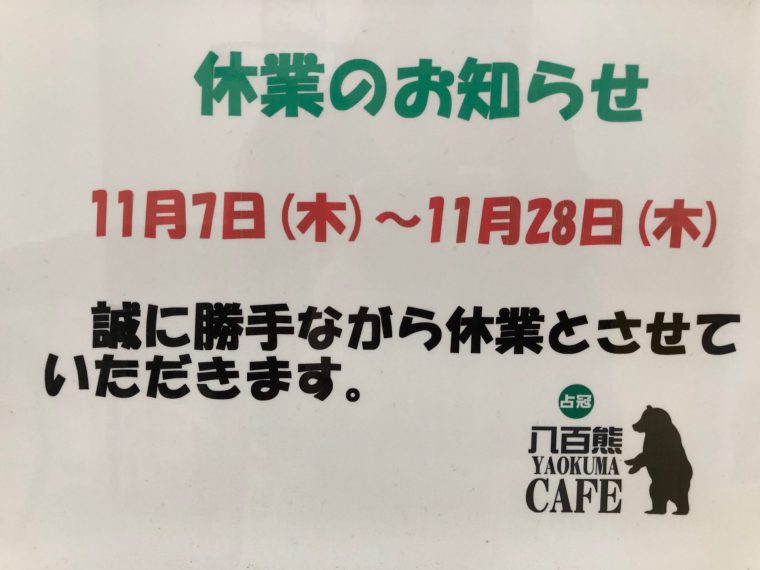 「八百熊カフェ」臨時休業