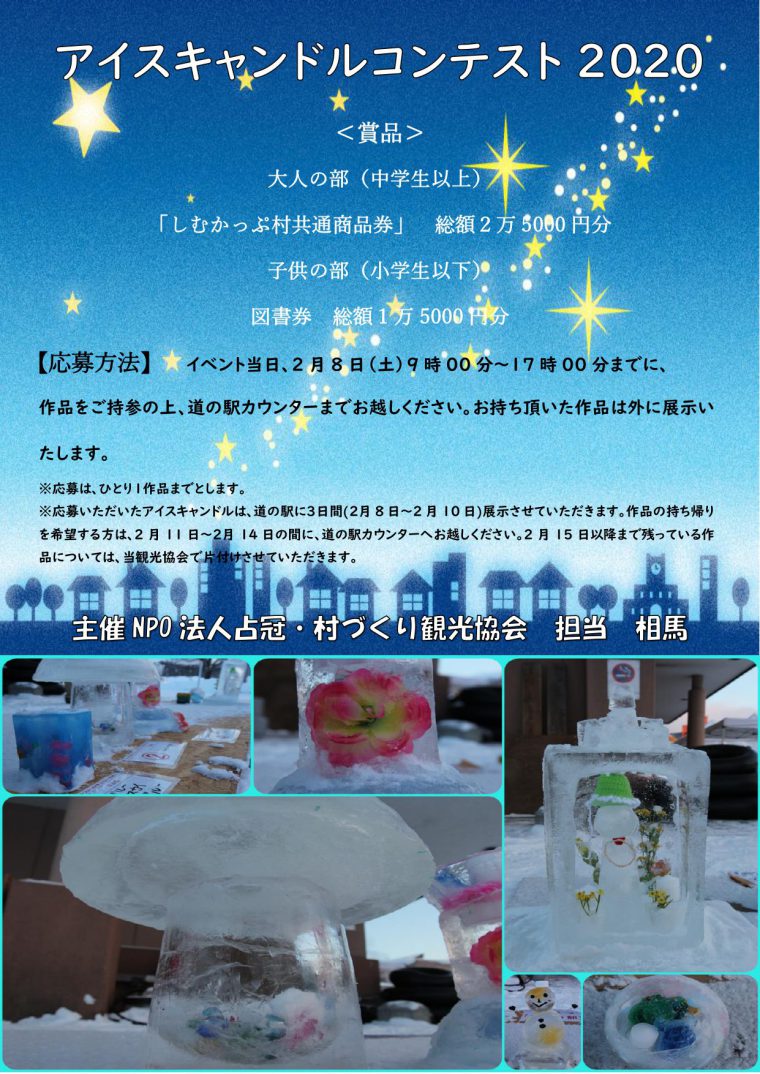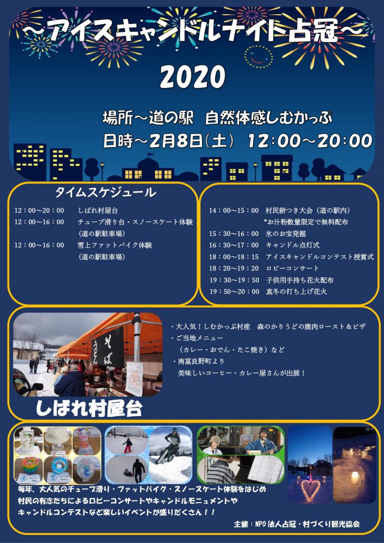 2月8日(土)12時から20時まで、道の駅『自然体感しむかっぷ』にて、占冠村の冬のお祭り「アイスキャンドルナイト占冠2020」が開催されます!
