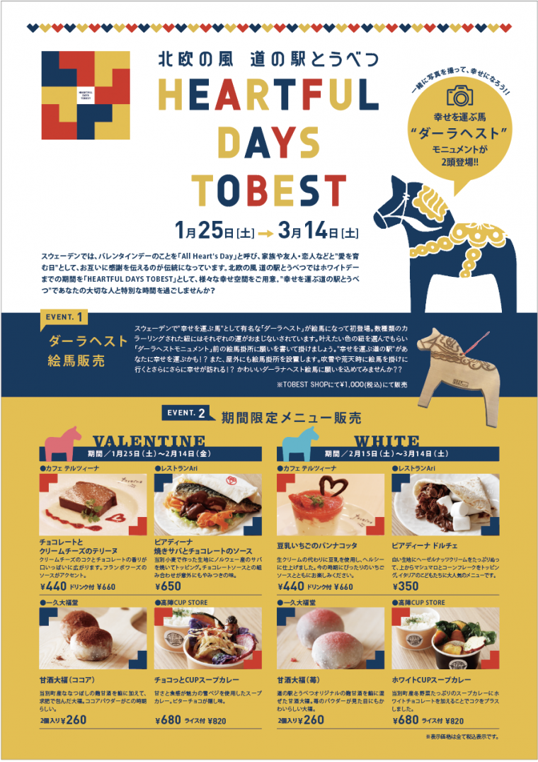 スウェーデンでは、バレンタインデーのことを「All Heart's Day」と呼び、家族や友人・恋人などと"愛を育む日"として、お互いに感謝を伝えるのが伝統になっています。北欧の風 道の駅とうべつではホワイトデーまでの期間を「HEARTFUL DAYS TOBEST」として、様々な幸せ空間をご用意。"幸せを運ぶ道の駅とうべつ"であなたの大切な人と特別な時間を過ごしませんか?
