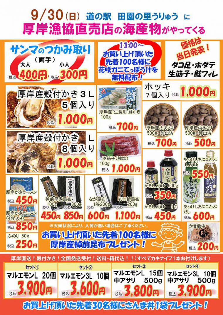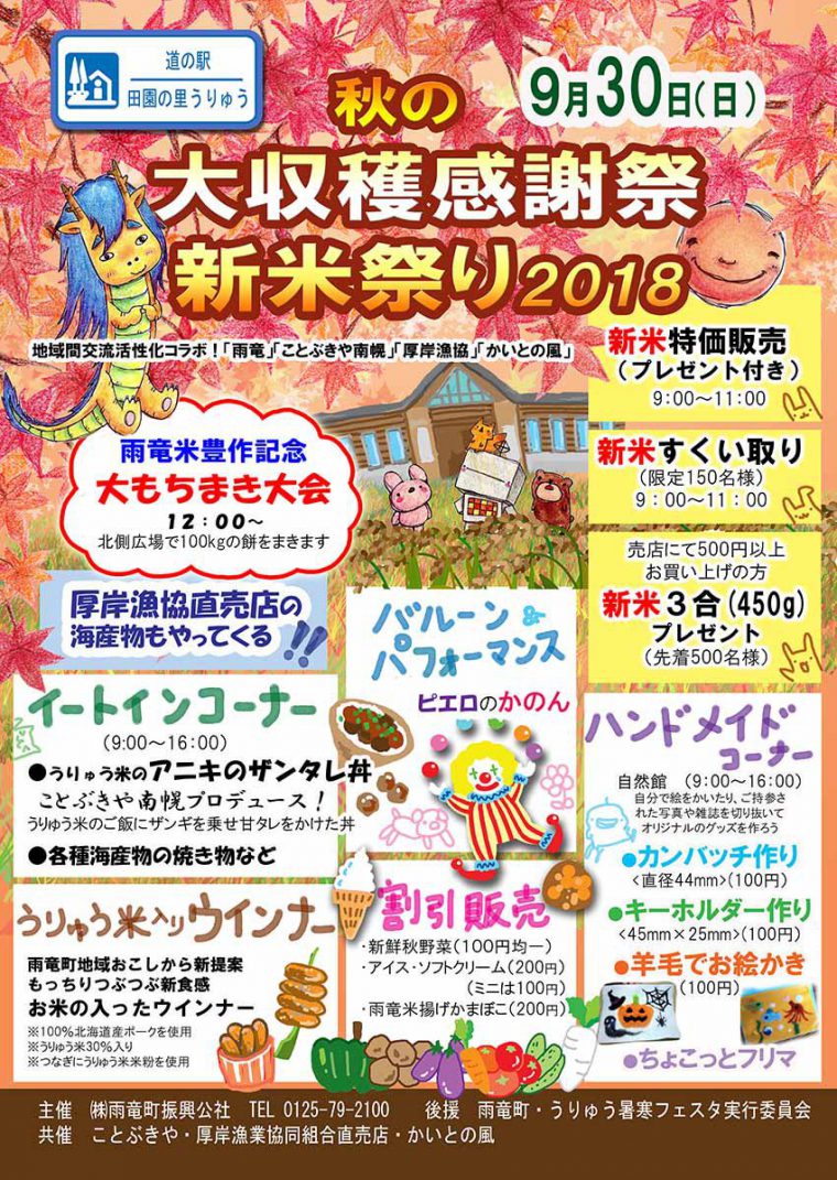 9月30日(日)9:00より 毎年恒例の秋の収穫大感謝祭・新米祭りを開催いたします。 当日はうりゅう米の新米販売やお米すくい、もちまきや 厚岸漁協より海産物の販売をいたします。 例年ですが、大変込み合いますので、売り切れ等もございます。 その際は申し訳ございませんが、ご了承ください。 印刷する
