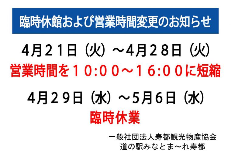 この度の新型コロナウイルス感染拡大による緊急事態宣言発令に伴い、道の駅みなとま~れ寿都では下記の期間、臨時休館および営業時間の短縮を実施いたします。