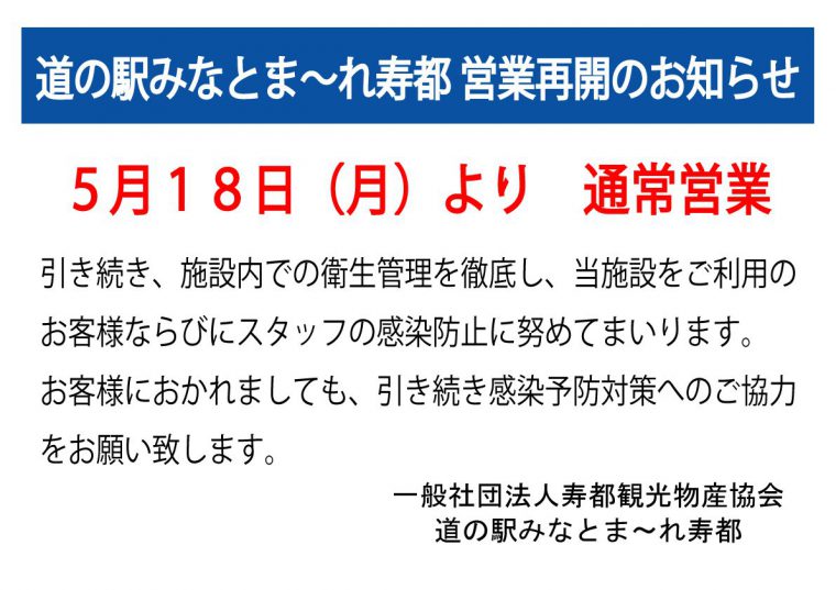 当駅では、新型コロナウイルス感染拡大による緊急事態宣言発令に伴い、4月29日(水)より臨時休館とさせていただいておりましたが、5月18日(月)より営業を再開致します。